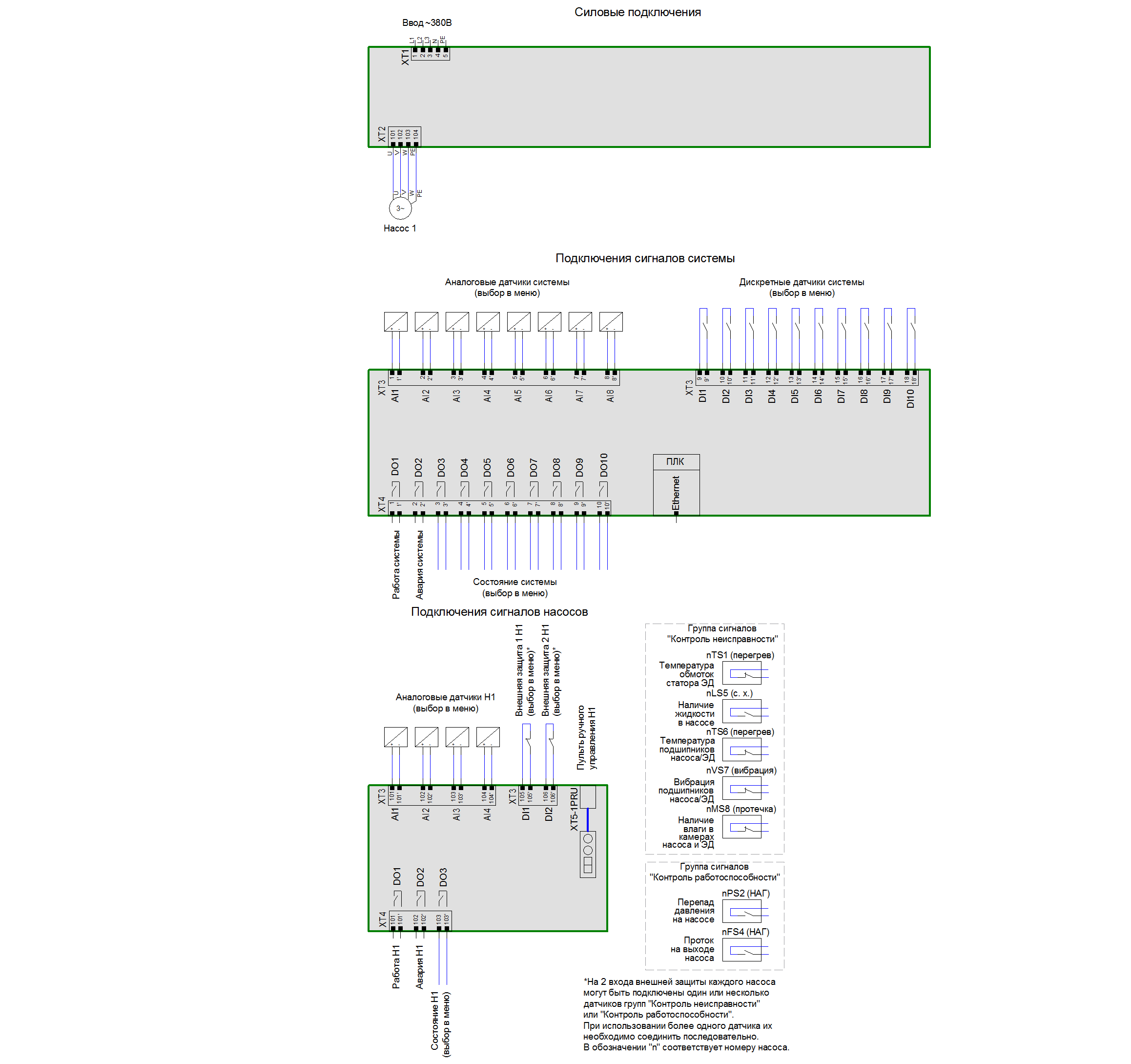 Схема подключений общая - тип шкафа U (со встроенным блоком автоматики), 1 насос, 1 ввод питания